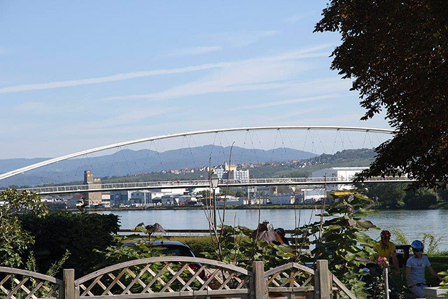 En contrebas, et jusqu’au pied de la passerelle, se trouve une petite plage de cailloux, où vivent de nombreux cygnes et toute une variété de canard sauvage. (Passerelle ayant la plus longue portée libre du monde, 238 m). Au loin, à quelques Km, on voit le début de la forêt noire (Schwarzwald).
